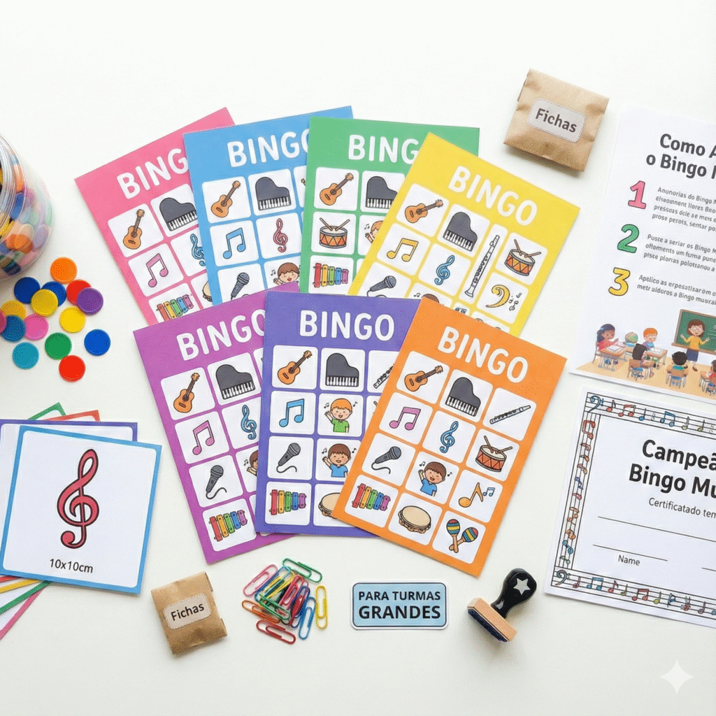 Bingo Musical para Grupos — Material pronto para turmas grandes que desenvolve percepção auditiva através da interação